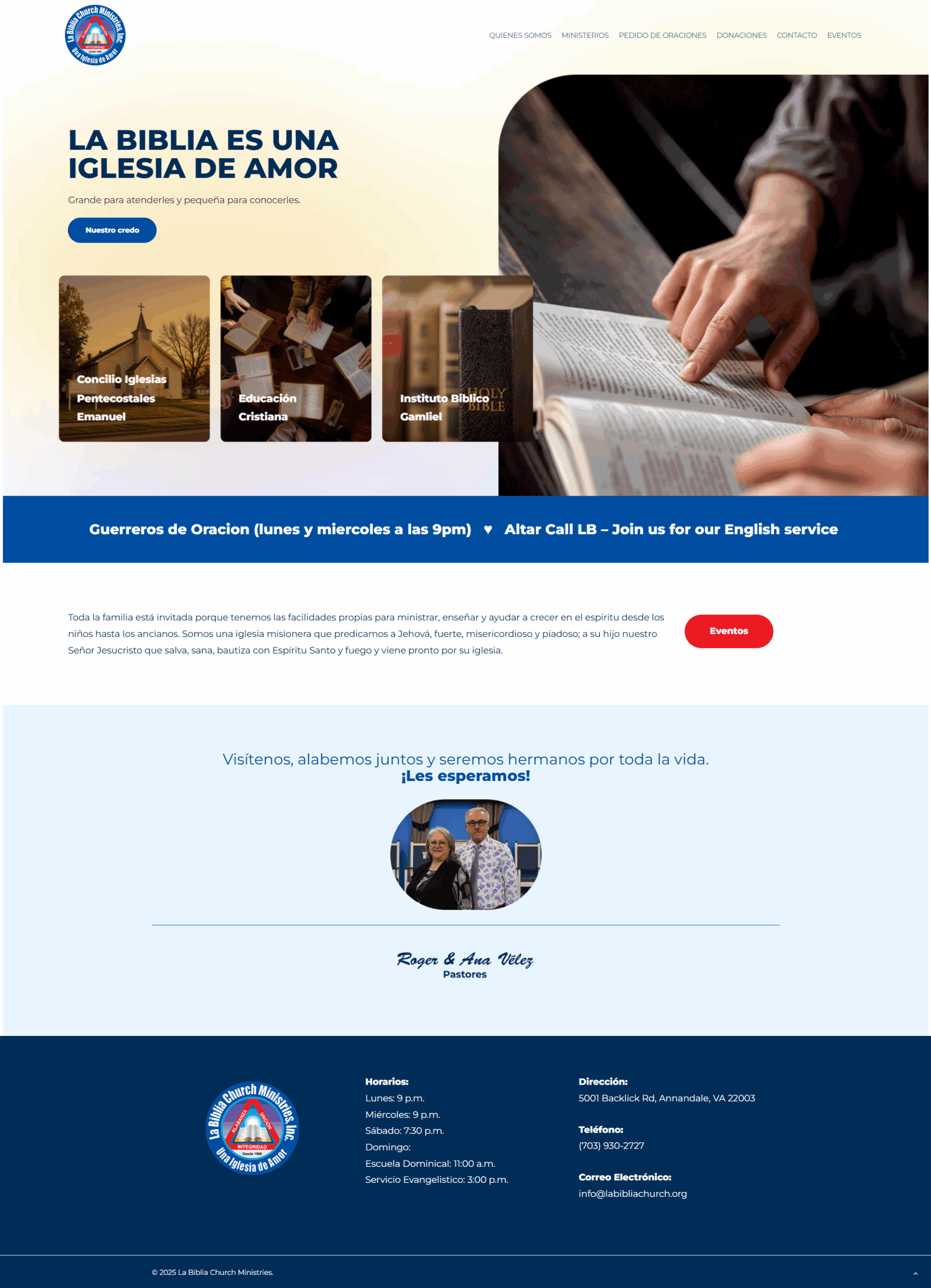 This project showcases the website design for La Biblia Church Ministries, crafted to reflect the values of faith, community, and connection. The design emphasizes warmth, accessibility, and clarity, creating a digital space where visitors can easily engage with the ministry’s message and resources.